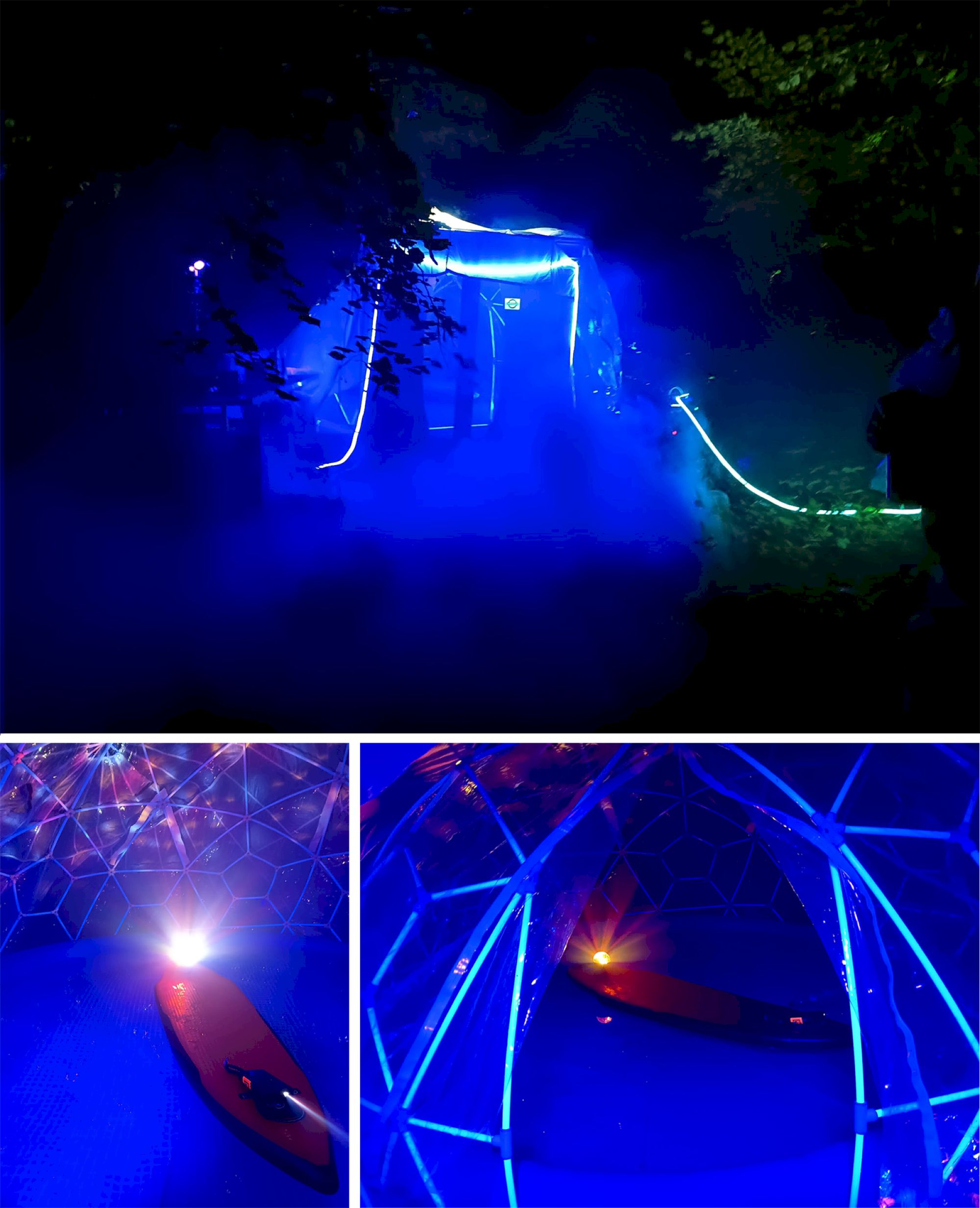 Tard dans la nuit, à mi-chemin, une installation lumineuse et fumigène de Charon Obulus transperce les ombres obscures. Je pénètre dans une tente translucide qui enveloppe une piscine gonflable autoportée. Aussi fascinant que cela puisse être, c’est une nuit chaude, parfaite pour une baignade nocturne. Je jette un coup d’œil à droite, puis à gauche, et après m’être assurée qu’il n’y a personne, je saute dans la piscine. Je ne suis ni la première ni la dernière à adopter une approche opportuniste de cette œuvre d’art.