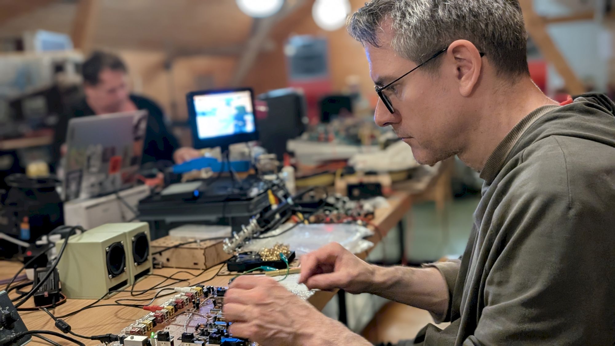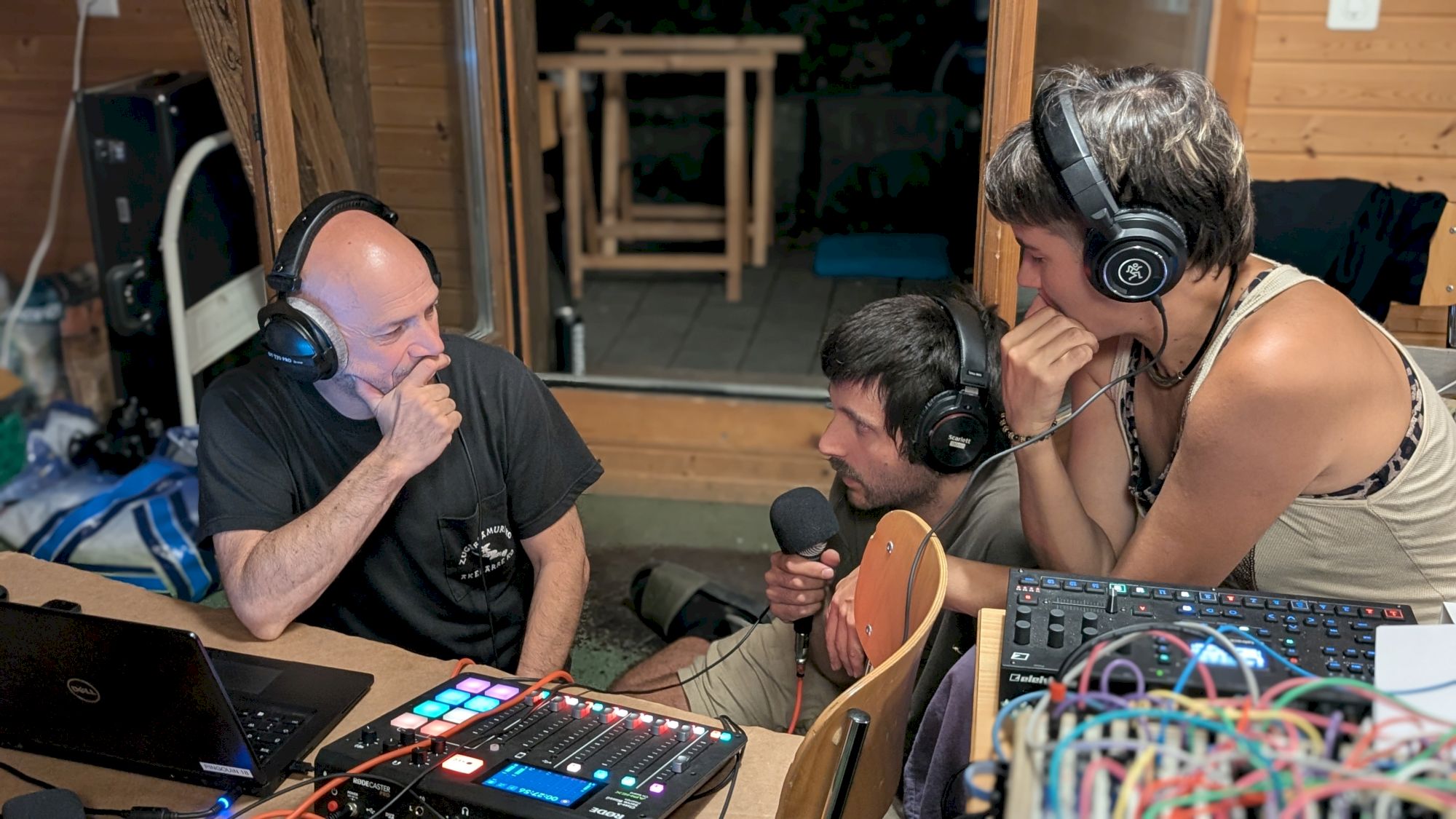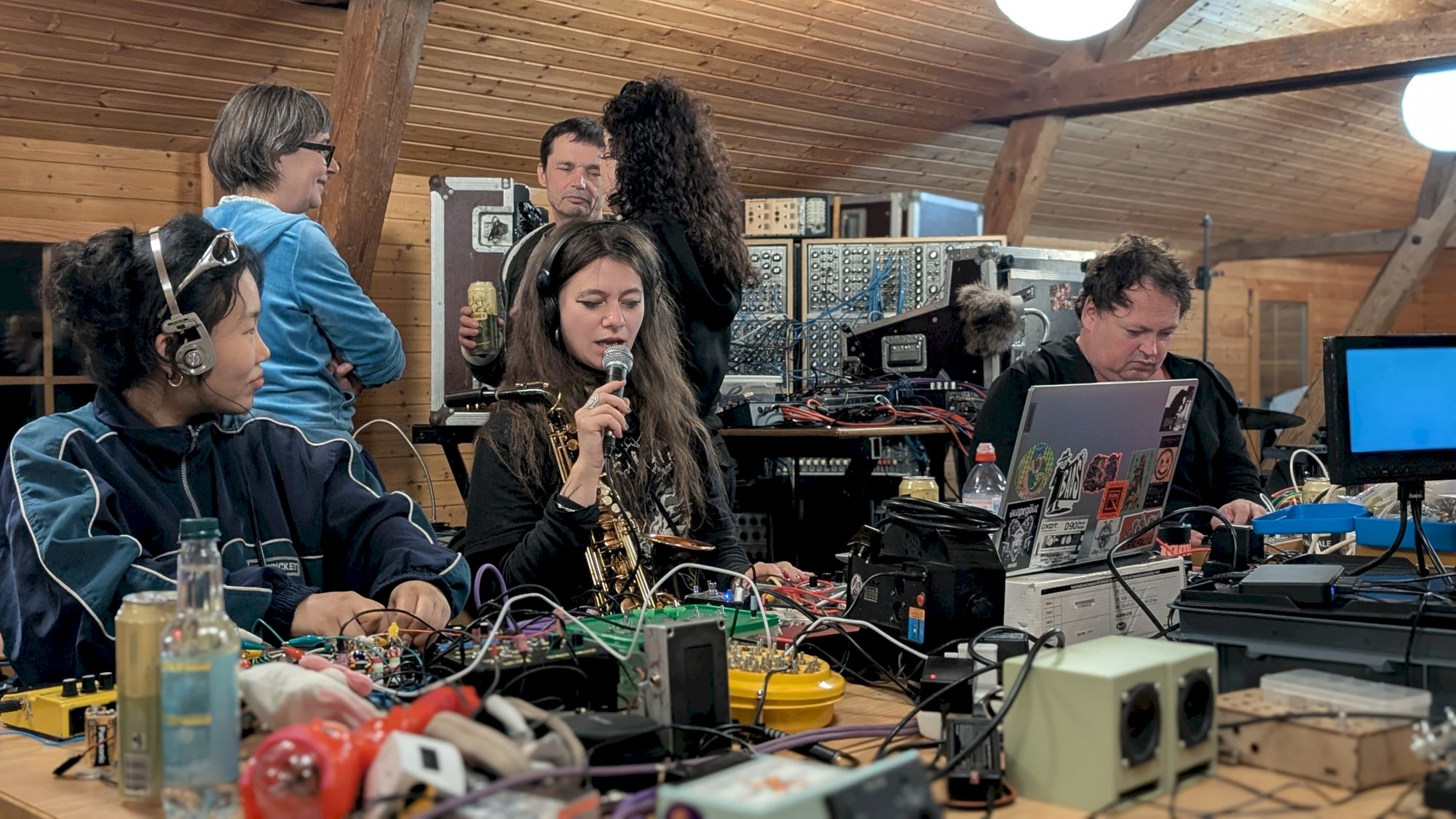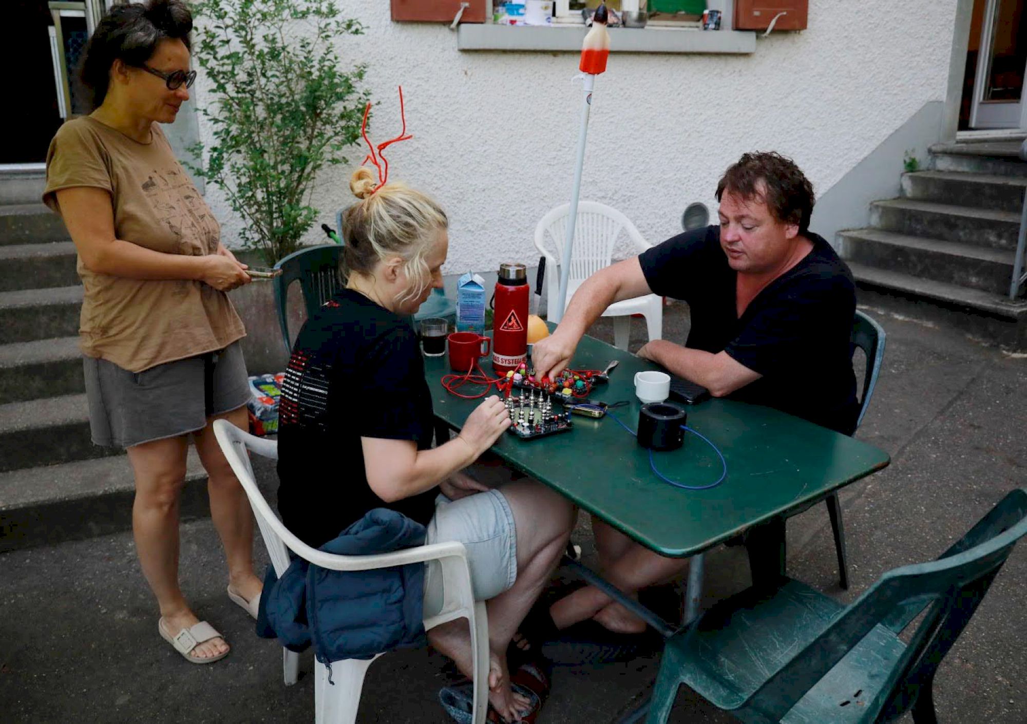 Le lendemain matin, le Waldhaus s’était transformé en paradis du DIY, chaque centimètre carré recouvert d’appareils électroniques, où la soudure ne s’arrêtait jamais. Une pièce plus calme à l’arrière avait été aménagée en studio de radio pour les interviews.