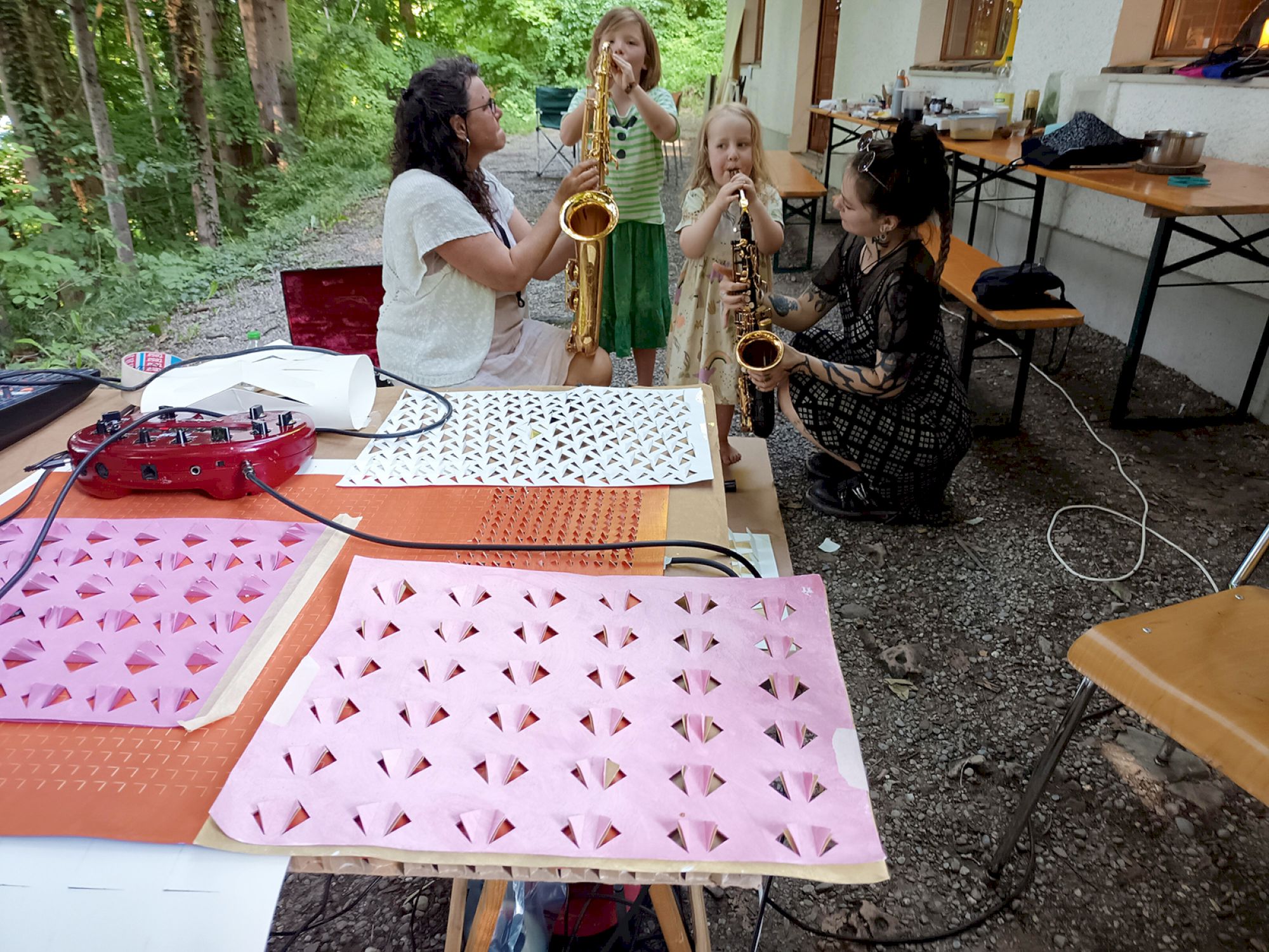 Il n’y a pas de scène fixe pour les concerts ; nous déambulons dans la forêt et entre les deux maisons, guidés par le programme. Chaque musicien a construit son propre dispositif, transformant chaque coin en une nouvelle scène.