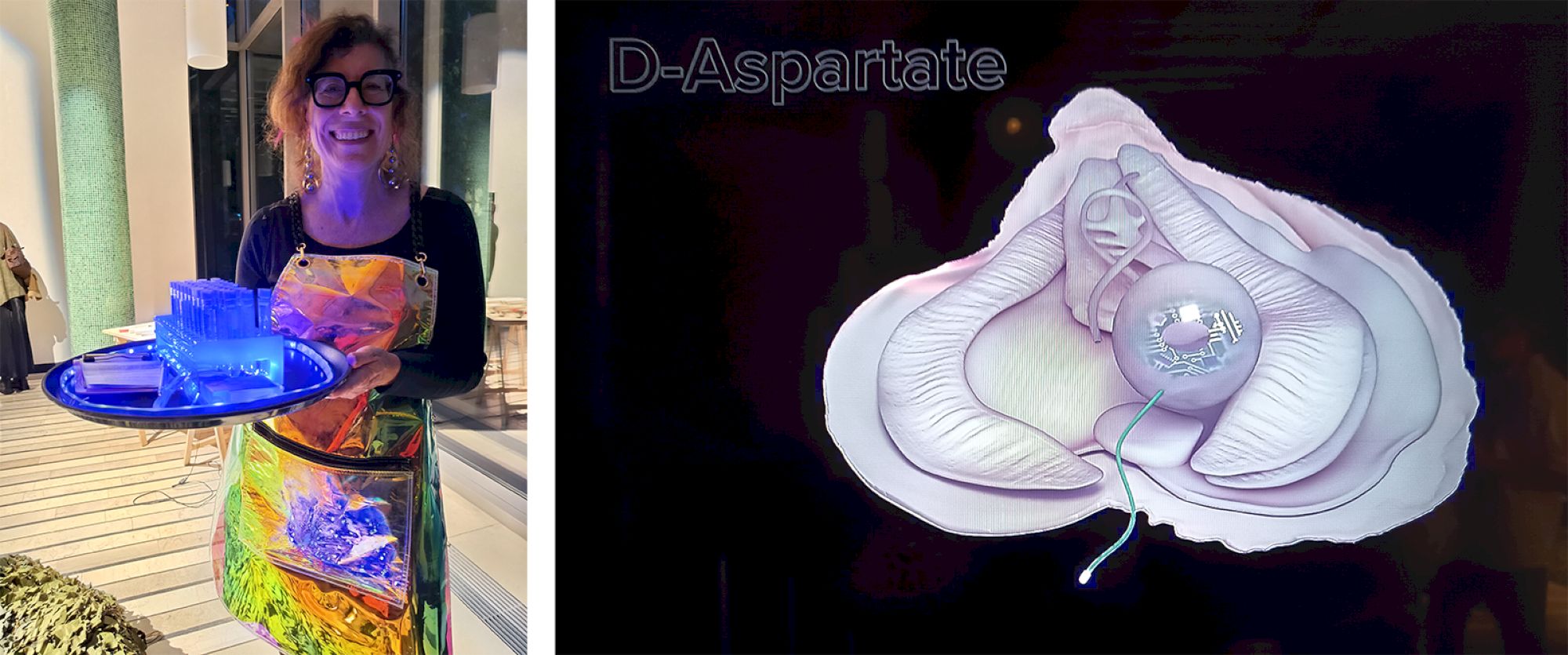 « Aquadisia » est un projet ludique de performance et de design spéculatif de Stephanie Rothenberg qui joue sur le mythe de l’huître comme aphrodisiaque pour réimaginer une relation plus symbiotique entre les humains et les autres espèces. Il fusionne cela avec l’esthétique du télémarketing, où des publicités pseudo-scientifiques promettant tout, de la jeunesse éternelle à la perte de poids sans effort.