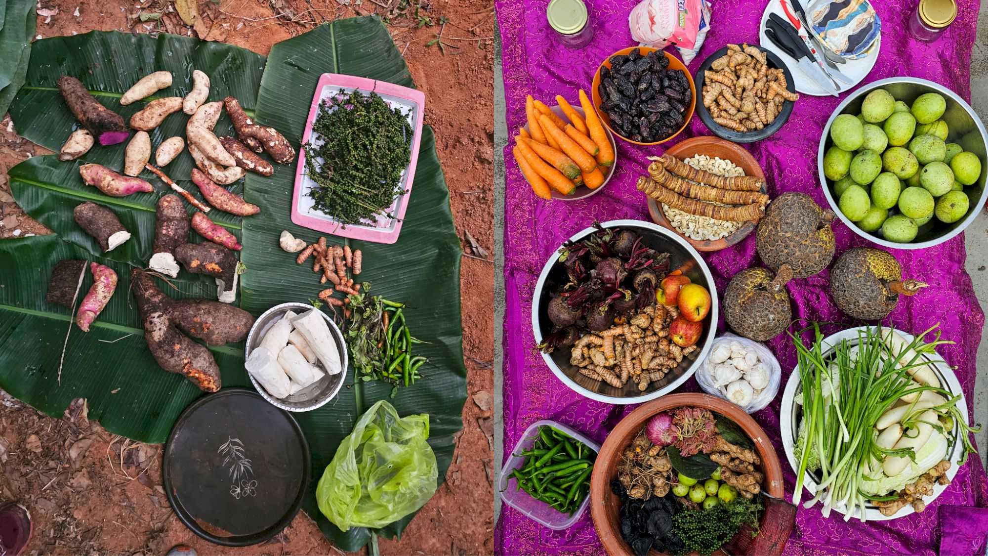 The first phase brought participants to organic farms in the Western Ghats mountains of Kerala, where they met custodian farmers and took part in a harvest at artist Vivek Vilasini’s food forest (read Vilasini in Makery). This experience, which highlighted the edible biodiversity nurtured by farmers, artists and activists, concluded with a convivial ceremony centered on a vegan version of the Peruvian Pachamanca, led by artist Daniela Zambrano Almidón. Dating back to pre-Incan times and traditionally used in religious festivities and celebrations, the Pachamanca is a form of earth-fire cooking that honors Pachamama, the Incan earth goddess.