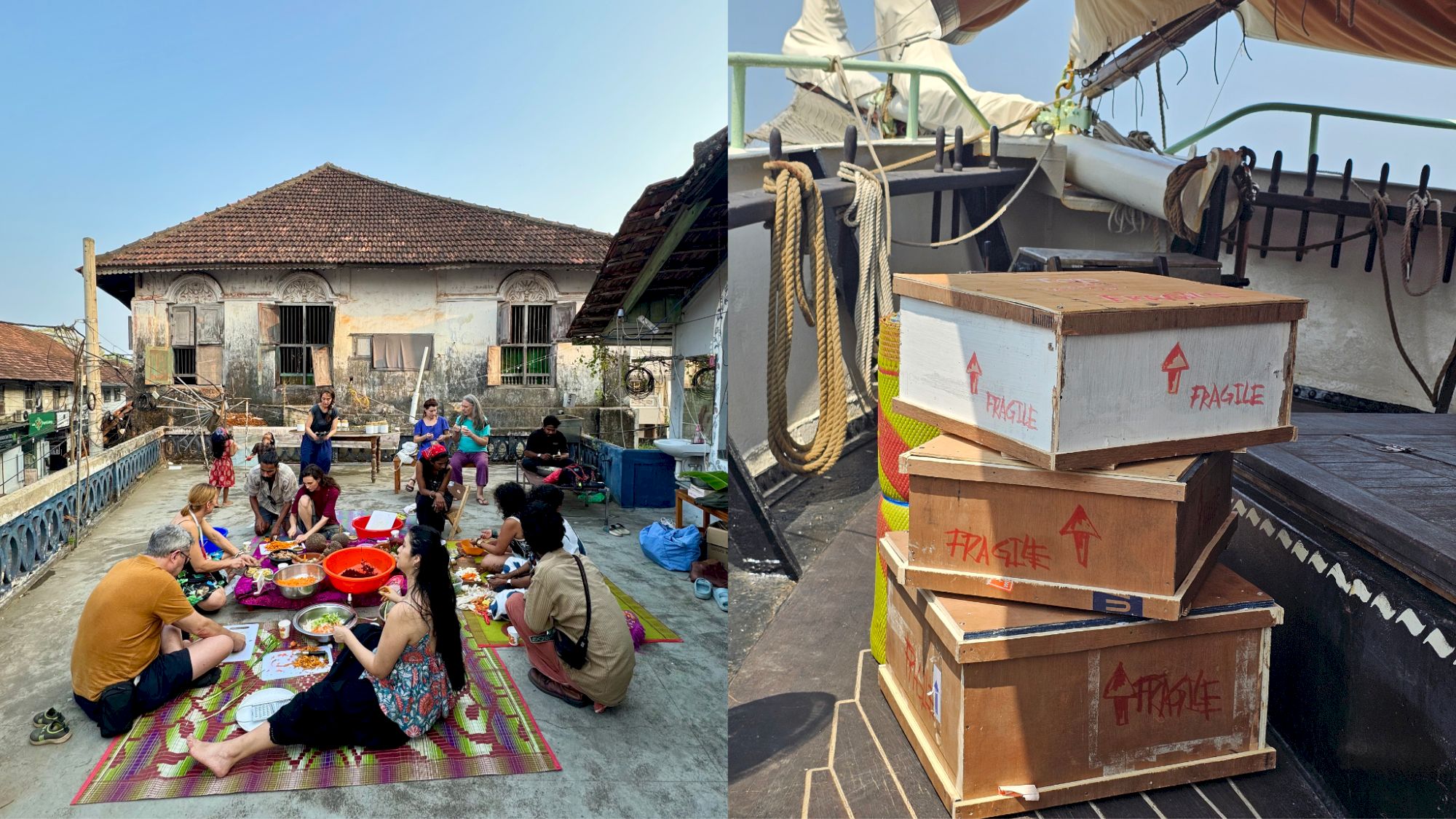 This upcoming voyage, from Kerala to the Mediterranean coast of Europe, echoes the contemporary renaissance of cargo sailing, which is being redeveloped as a low-carbon mode of transport. Sail freight refers to the environmentally focused transport of cargo by wind-powered vessels, offering an alternative to fuel-based shipping through traditional or modern sailing technologies, sometimes supported by auxiliary engines. It revives historical practices of maritime trade while emphasizing sustainability, ethical transport, and reduced carbon footprints. Food transport is the most striking example of this, combining sustainable transport and fair trade (read our previous report at the first Soil Assembly). The Arka Kinari’s current voyage from Kerala to the Mediterranean coast of Europe echoes this contemporary revival of food transport by sail, positioning this maritime mobility as both an artistic practice and a political response to climate justice. The fermented foods will reach the Mediterranean this summer, and the slow fermentation of these collective actions from the mountains of Kerala to European harbors will be celebrated with food and music.