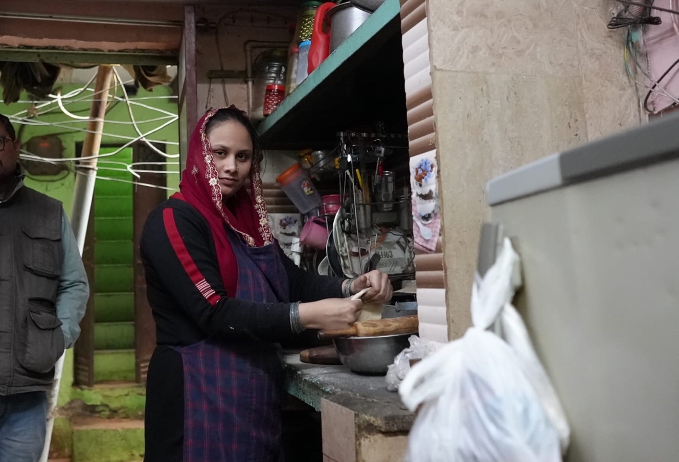 The place is in New Seelampur, consists of very simple dwellings, but has got basic access to water and electricity. In this particular neighbourhood people are specialised on separating wires, so it is only wires, yet in all sizes, shapes and qualities, that are being processed here. Mostly women, young children and elderly people are involved in stripping the plastic off the copper, aluminium and iron wires. They do that at home, in their living room, chatting and joking while working together. We pass by a room that is directly accessible from the street. My guide, Vinod, asks the ladies sitting inside, if we may enter. They quickly put on their hijab and welcome us in. There is a lady in her 40s who works with her teenage daughter on dismantling a colourful and entangled pile of thin wire. She tells me that she cannot use gloves for protection while cutting off PVC, because she needs to feel the knife to not injure herself. I watch her sitting on a woven carpet, holding one end of the long wire in her right hand, the other end of the wire with the toes of her left foot, pulling the plastic cover with her left hand off the wire. As she continues her hard manual labor I remember how as a child I learned to knot bracelets. I did that in a similar body position, only that instead of pulling off hard plastic coating I was only pulling up a thread to start a new line of knotting on my bracelets. In this way in reminds me of making traditional crafts. Taking off plastic from wire, ripping off ten to twenty centimetres at a time, requires a lot of force. I ask the lady what she would prefer to do, if she can choose: cooking or dismantling wires? She points to a young woman currently preparing bread in the other corner of her living room: “This is my daughter in law. She does the cooking”.